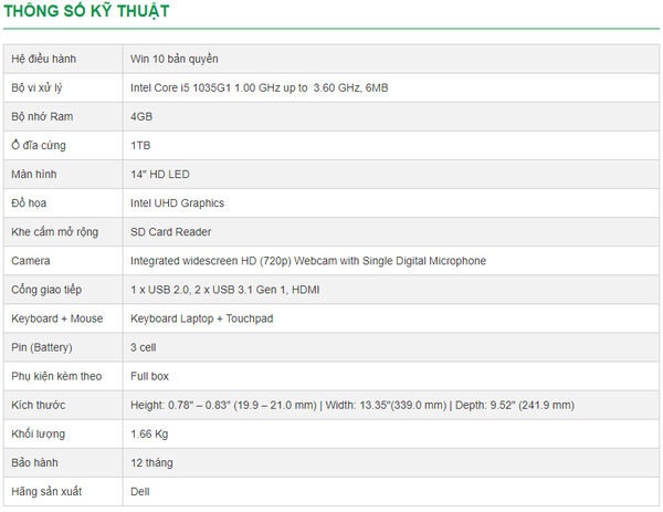Giới thiệu về sản phẩm Laptop Dell Inspiron 3493-N4I5136W (Đen) i5-1035G1/4GB/1TB